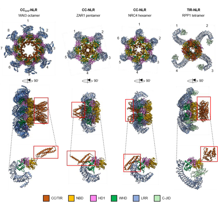 Plants may not have white blood cells, but they are far from defenseless. Instead, they rely on specialized immune receptors called NLRs (nucleotide-binding leucine-rich repeat receptors) to recognize intracellular invaders and trigger strong defense responses. These receptors are molecular shape-shifters, assembling into large multi-protein complexes known as resistosomes. For example, the ZAR1 resistosome forms a pentamer, NRC4 assembles as a hexamer, and RPP1 as a tetramer. In a recent study, Guo and colleagues uncovered an unusual case in wheat through a forward genetic screen. They identified an EMS mutant in the gene Wheat Autoimmunity 3 (WAI3), which shows constant activation of plant immunity. WAI3 belongs to a unique sub-clade of G10-type coiled-coil NLRs, distinct from other CC-NLRs. When expressed in Nicotiana benthamiana, a truncated (inactivated) version of WAI3 unexpectedly formed an octameric resistosome—the largest oligomeric assembly reported for plant NLRs so far. Intriguingly, WAI3 lacks the EDVID domain, a structural element that stabilizes domain interactions in other resistosomes. This absence results in a distinct domain arrangement and LRR topology. While WAI3 still exhibits calcium channel properties like ZAR1, the significance of its unusual architecture remains an exciting open question for future research. (Summary by Ching Chan @ntnuchanlab) bioRxiv 10.1101/2025.08.26.672026