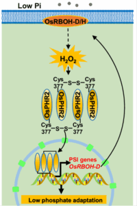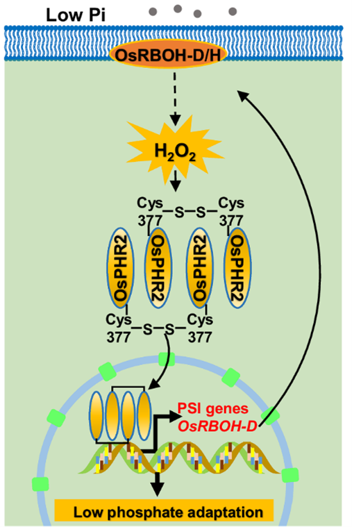 Phosphorus (P) is one of the indispensable macronutrients that fuel plant growth and development. However, most soil P is locked in insoluble complexes with heavy metals, making it largely inaccessible to plants. In rice, the MYB transcription factor PHOSPHATE STARVATION RESPONSE 2 (OsPHR2) acts as a central regulator of phosphate starvation-induced (PSI) genes to promote P uptake. Its activity is fine-tuned through intricate post-translational modifications and protein-protein interactions involving SPX proteins, inositol pyrophosphates (PP-InsPs), and SUMOylation. Intriguingly, Meng and colleagues uncovered a new messenger in phosphate starvation signaling: hydrogen peroxide (H₂O₂). Phosphate deficiency triggers H₂O₂ production, which in turn activates PSI gene expression. Loss of RBOH-D/H, enzymes responsible for H₂O₂ generation, impairs H₂O₂ accumulation, phosphate uptake, and plant biomass. Through BIAM labeling and site-directed mutagenesis, the team identified Cys377 of OsPHR2 as the key oxidation site mediating its oligomerization, nuclear translocation and DNA-binding activity. Moreover, OsPHR2 directly activates OsRBOH-D, establishing a positive feedback loop that amplifies phosphate starvation responses. This discovery not only redefines H₂O₂ as a pivotal messenger linking redox signaling to nutrient regulation but also opens new avenues for engineering crops with enhanced phosphate-use efficiency in the face of global resource constraints. (Summary by Ching Chan @ntnuchanlab) Nature Comms. 10.1038/s41467-025-63841-0