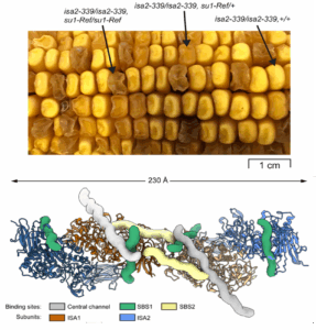 Plants store glucose polymers in semicrystalline starch granules. Starch debranching enzymes, including isoamylases (ISAs), are involved in maintaining starch’s crystalline organization. In maize, sugary1 (su1) mutants with impaired ISA1 enzymatic activity accumulate soluble polyglucan chains (phytoglycogen). Unlike ISA1, ISA2 is enzymatically inactive. However, it remains selected for in plants, and is structurally conserved including an additional β-sandwich domain not present in ISA1. Hennen-Bierwagen and colleagues investigated the non-enzymatic functions of the maize ISA1-ISA2 complex, using non-catalytic ISA1 alleles that accumulate varying starch/phytoglycogen ratios. Removing ISA2 exacerbated the ISA1 phenotypes, demonstrating it has non-enzymatic functionality. AlphaFold3 models revealed 8 glucan binding sites in the ISA1-ISA2 heterotetramer, with the point mutations clustering in the border lobe, affecting polyglucan binding. The non-enzymatic functions of the ISA complex may include recruitment of binding-partners to these glucans, or shielding them from other proteins. Bringing these glucan chains into proximity with one another may promote helix formation, which gives starch its crystallinity. Crucially, this paper highlights the importance of considering the non-enzymatic functions of proteins, and how structural modelling can shed light on these roles. (Summary by Ciara O’Brien @ciara-obrien.bsky.social) Plant Cell 10.1093/plcell/koaf220