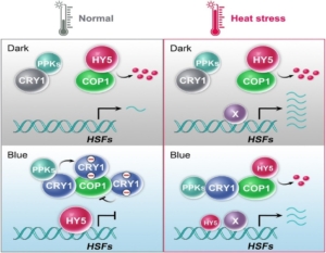 Plants use several photoreceptors to perceive light including the cryptochromes (CRYs), which are implicated in blue-light reception and coordinate developmental processes including photomorphogenesis. Here, Liu et al. shed light on how light and temperature cues simultaneously affect plants. They identified a molecular mechanism by which blue-light negatively regulates thermotolerance in Arabidopsis through the CRY1-COP1-HY5 signaling axis. At normal temperatures, CRY1 becomes phosphorylated in a photoregulatory protein kinase (PPK)-dependent manner, enhancing the interaction between CRY1 and CONSTITUTIVELY PHOTOMORPHOGENIC 1 (COP1), an E3 ubiquitin ligase. The interaction between CRY1 and COP1 inhibits COP1 activity, therefore ELONGATED HYPOCOTYL 5 (HY5) is stabilized. Accumulated HY5 proteins then bind to the promoters of the heat-shock transcription factors (HSF) genes, repressing their transcription and dampening the heat stress response under blue light. However, at high temperature, heat stress impairs the activity of PPKs, reducing CRY1 phosphorylation. Consequently, CRY1-mediated suppression of COP1 weakens, allowing it to regain its E3 ligase ability. The resulting degradation of HY5 lifts repression of HSF genes, leading to increased HSF expression compared to the response under blue light at normal temperatures. (Summary by Nathaniel Oragbon @NathanIgwe) Plant Comms. 10.1016/j.xplc.2025.101264