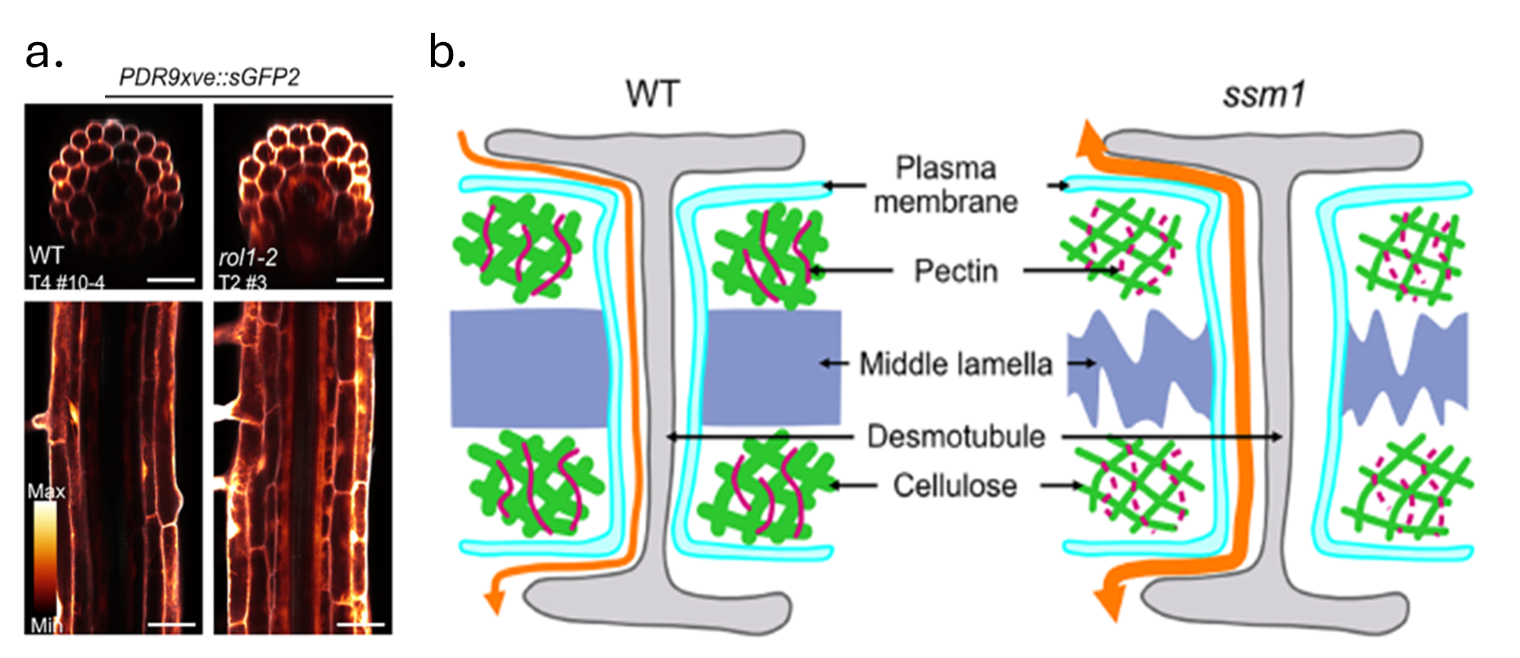 In plants, plasmodesmata provide essential symplastic connections for the movement of nutrients and signals. While their role in developing roots is well established, whether they contribute significantly to radial nutrient transport once roots are fully differentiated is still poorly understood. To address this, Jacquier et al. used tracer dyes and cell-type-specific fluorescent reporters to study symplastic transport in both differentiated and undifferentiated Arabidopsis roots. They show that plasmodesmata-mediated transport continues to occur in differentiated roots and, more importantly, undergoes a developmental switch, wherein movement is bidirectional in young roots but becomes unidirectional towards the vasculature after differentiation. Furthermore, a forward genetic screen looking for enhanced movement of GFP identified the sesame1 (ssm1) mutant (named for the story of Ali Baba and “open sesame”). Further analysis showed that ssm1 is allelic to repressor of lrx1 (rol1), which is defective in rhamnose biosynthesis and displays enlarged plasmodesmata apertures, altered cell wall architecture (pectin, cellulose and callose), and enhanced bidirectional transport. Surprisingly, despite these pronounced cell wall defects, only mild nutrient imbalances were observed in the mutant. Still, ssm1 recovered better after drought stress, hinting at adaptive benefits of altered plasmodesmata regulation. This study therefore establishes a direct link between cell wall composition, especially pectin organization, and plasmodesmata function. It also highlights a previously unrecognized developmental reprogramming of symplastic transport, with important implications for how plants balance nutrient flow and stress resilience. (Summary by Aditi Bhat @jumpy_botanist) Mol. Plant 10.1016/j.molp.2025.07.004)