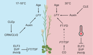 Flowers are not only a source of beauty and awe but also an important agronomical trait, since many crop yields depend on the proper timing of flowering. With increasing fluctuations in temperature, plants must finely tune the flowering process. In Arabidopsis thaliana, flower primordia formation at colder temperatures depends on CLAVATA (CLV) peptide signaling, but how flowers are maintained at warmer temperatures has remained unclear. In a new study, Smith et al. reveal that the mobile flowering signal florigen, composed of FLOWERING LOCUS T (FT) and TWIN SISTER OF FT (TSF), buffers flower production in warm environments. Using crn/clv2 mutants defective in CLV signaling, the authors found that heat-induced FT expression bypasses the requirement for CLV signaling, restoring flower primordia outgrowth. Surprisingly, this restoration does not rely on auxin biosynthesis. Instead, florigen interacts with shoot apical meristem transcriptional regulators such as FD and LEAFY to sustain flower initiation and development. Continuous florigen production after floral transition proved necessary to canalize flower formation, contrasting with florigen’s classic switch-like role in flowering time control. Together, the results show that CLV signaling and florigen act in parallel and synergistic pathways to ensure robust flower production across temperature regimes. These insights are highly relevant for future breeding efforts to create crop varieties resilient to temperature fluctuations. (Summary by Katarina Kurtović, katarinakurtovic.bsky.social) Curr. Biol. 10.1016/j.cub.2025.06.001
