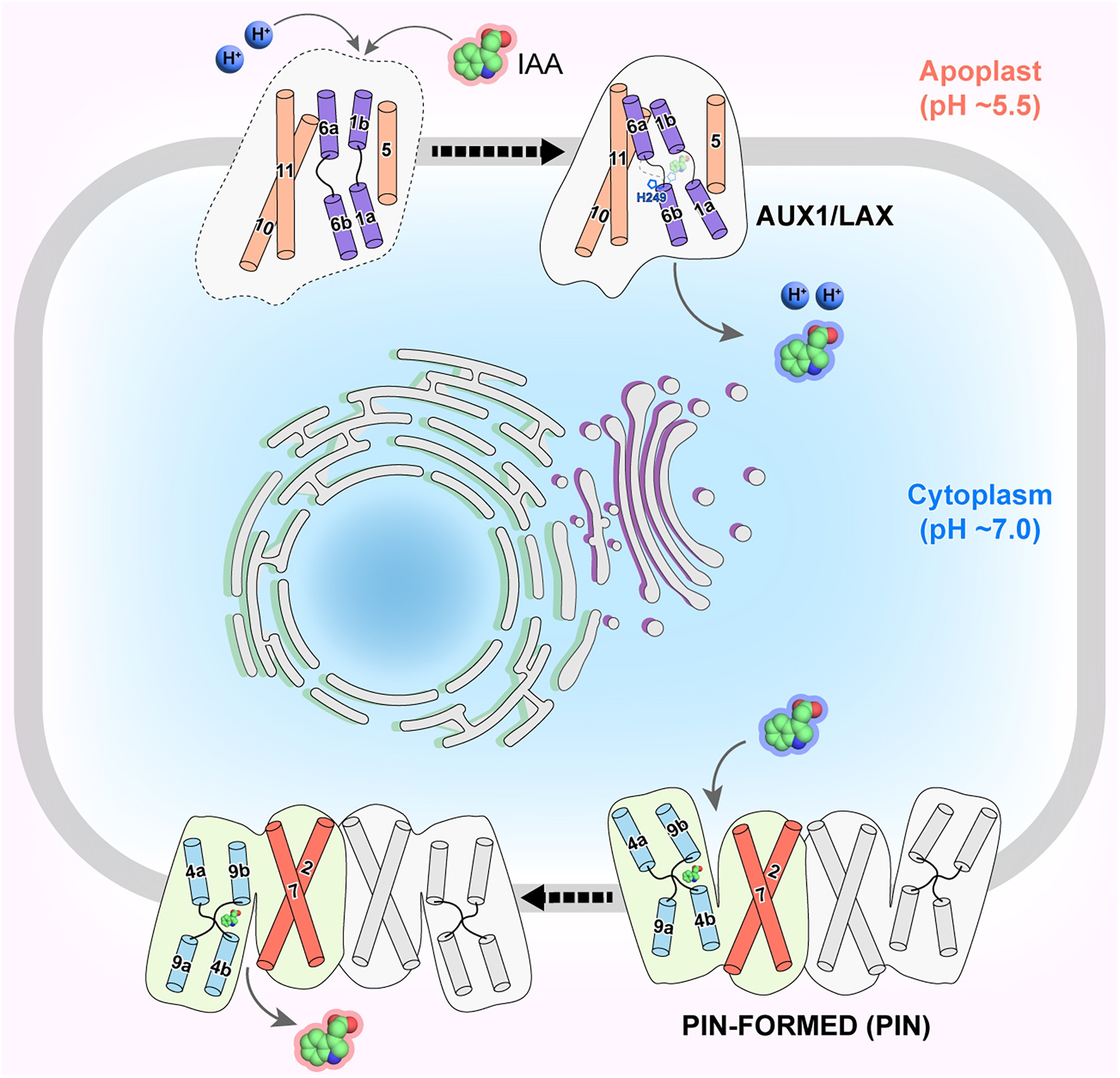 Polar auxin transport is central to plant development, relying on coordinated activity of influx carriers (AUX/LAX), efflux carriers (PINs), and ABCB transporters. While structural insights and transport mechanism of PIN proteins has been available, those of the AUX/LAX family have remained unresolved. In a recent study, Yang et al. (2025) reported the first structure of the Arabidopsis thaliana auxin importer AUX1 using cryoelectron microscopy at 3.5 Å resolution. Because AUX1 is a small 54 kDa protein, the authors fused it to a protein apocytochrome b562 from E. coli to facilitate the cryo-EM and determined structures of both the free-state and the auxin-bound state. Biochemical assays revealed that purified AUX1 has a higher auxin binding affinity compared to PIN efflux carriers, and unlike PINs, AUX1 functions as a monomer. Strikingly, the mechanism of auxin transport by AUX1 relies one key amino acid, H249. This amino acid acts as a pH-dependent switch where its protonation in the acidic apoplast stabilizes auxin binding, while deprotonation in the neutral cytoplasm weakens binding and promotes auxin release. Furthermore, the authors confirmed that the auxin influx inhibitor CHPAA competes with indole-3-acetic acid for the same binding site. This structural breakthrough completes the picture of polar auxin transport by providing molecular insight into both influx and efflux carriers, advancing our understanding of auxin action in plants. (Summary by Katarina Kurtović, katarinakurtovic.bsky.social) Cell 10.1016/j.cell.2025.04.028