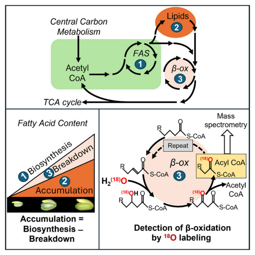 For decades, plant lipid research followed a simple narrative: seeds accumulate oil during development, then break it down after germination to fuel seedling growth. In a landmark study, Koley et al. overturn this binary view with compelling evidence that lipid metabolism is far more dynamic than previously believed. Using ¹⁸O-water isotope tracing across light/dark cycles they revealed that ‘fatty acid synthesis and degradation occur simultaneously throughout seed development’ a discovery that marks a paradigm shift in our understanding of oil accumulation. This finding reframes β-oxidation not as a dormant process waiting for germination, but as an active participant in seed maturation itself. Interestingly, attempts to enhance oil yields through genetic engineering often triggered compensatory degradation, preventing the expected gains. This suggests that living systems often prioritize balance over efficiency. The seed’s continual “make and break” cycle may appear wasteful at first glance, but it likely serves a deeper purpose: maintaining metabolic homeostasis, fine-tuning developmental signals, and preparing for environmental uncertainties. More broadly, the authors findings illustrate a fundamental principle: pressing harder on the biosynthesis “accelerator” without releasing the degradation “brake” leads only to metabolic friction. The next generation of high-oil crops may not develop from simply pushing productivity, but from aligning with the plant’s own regulatory rhythms and feedback networks. (Summary by Mohammad Aslam @asbiotech1) Cell Reports 10.1016/j.celrep.2025.115492