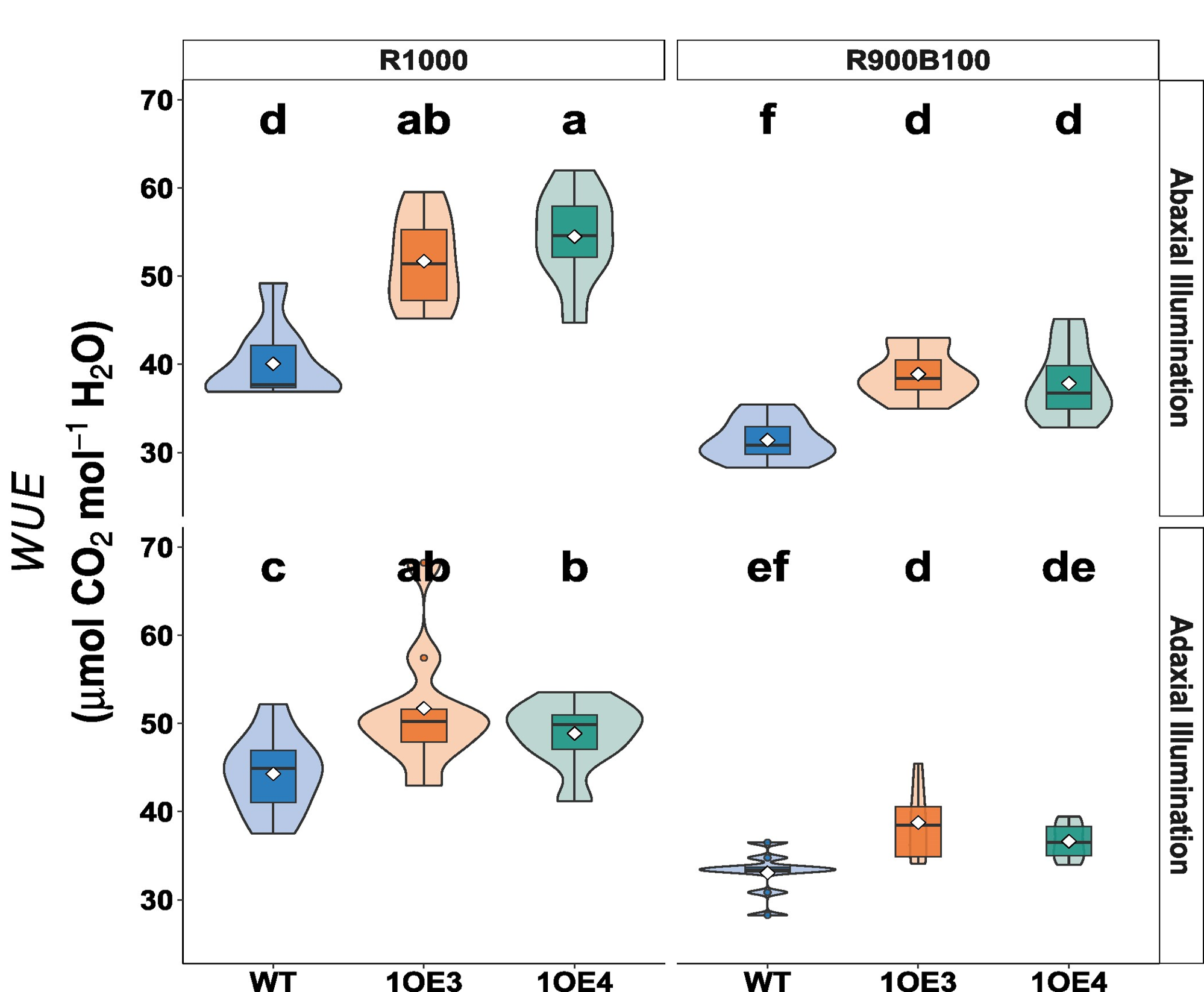 Stomata play an important role in balancing the amount of CO2 that goes in the plant for photosynthesis and the amount of water that goes out of the plant through transpiration. Stomatal density (SD) in plants has been studied with the goal of improving water-use efficiency (WUE) without sacrificing photosynthetic capacity. Fan et al. studied the effects of overexpressing Epidermal Patterning Factor 1 (EPF1) in wheat using a combination of dynamic gas exchange, anatomical measurements and molecular analyses. Results showed that SD was reduced in transgenic lines. In addition, the reduction in SD contributed to decrease in both photosynthetic rates (A) and stomatal conductance (gsw) in plants overexpressing EPF1 compared to the wildtype, particularly when there is high intensity of red light (R1000). However, upon addition of 10% blue light (R900B100), the transgenic plants showed a significantly high gsw but without a comparable change in A. Analysis of stomatal opening also showed that while the speed of stomatal opening is the same for both wildtype and transgenic plants, the reduced number of stomata and the lower aperture under red light results in lower gsw but increased sensitivity to blue light helps in maintaining photosynthetic rates. Overall, this study was able to show that reduction of SD in wheat results in reduction in A but with an accompanying increased sensitivity to blue light to compensate for the fewer stomata. This builds a foundation on stomatal density modifications that could lead to more water-use efficient crops in the future. (Summary by Mae Mercado) Plant Physiol. 10.1093/plphys/kiaf379