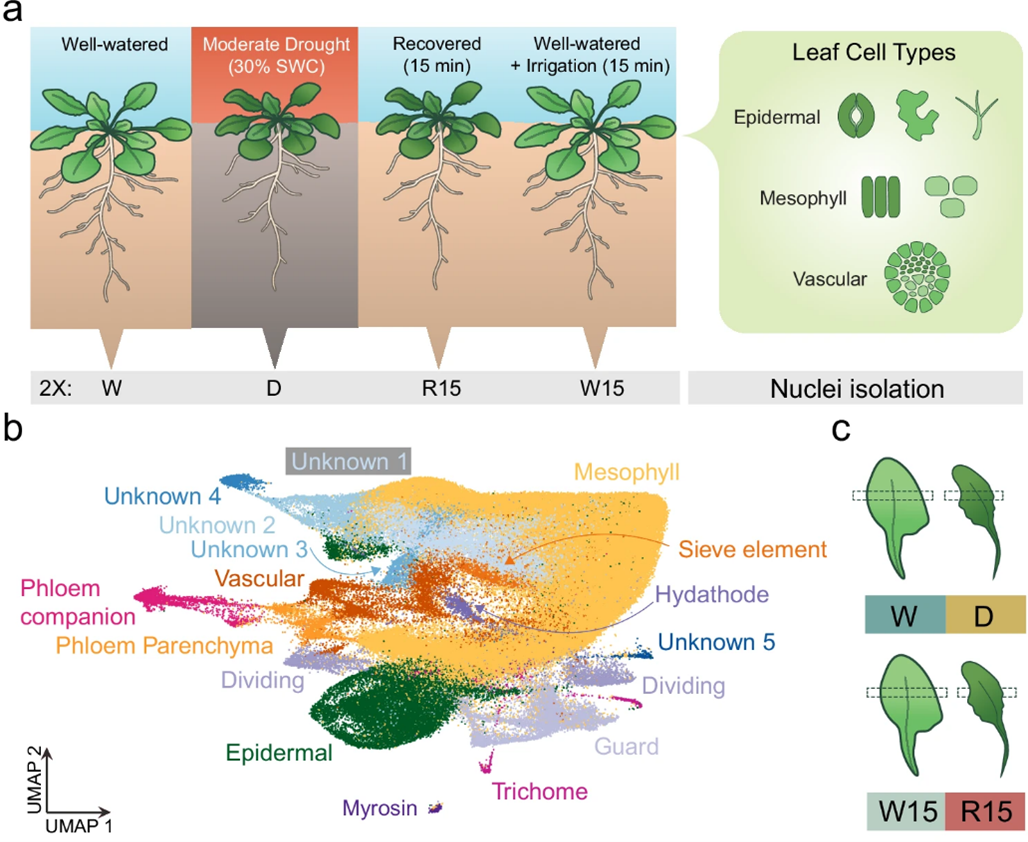 When drought strikes, plants struggle to survive. Growth slows, flowers appear too early, fruits drop prematurely, and harvests shrink. Scientists have long tried to engineer drought tolerance plants, but boosting this often comes with a hidden cost: stunted growth even when water is plentiful. This paradox raises a new question – what if the real key lies not in enduring drought, but in how plants recover once the rain returns? Illouz-Eliaz and colleagues explored this recovery phase using bulk and single-nucleus RNA sequencing in Arabidopsis. Tracking a fine-scale time series, they discovered that recovery is not simply the undoing of drought damage. Instead, it activates a unique genetic program, with over 3,000 genes expressed specifically during recovery – far exceeding the 1,248 genes responsive to drought itself. Single-cell resolution revealed 22 annotated cell clusters and 10-fold more differentially expressed genes than bulk RNA-seq, supported by spatial transcriptomics that mapped recovery-induced cell states across leaf tissues. Unexpectedly, some unannotated clusters were enriched in immune and stress-related functions, pointing to hidden layers of resilience. Motif analysis highlighted CAMTA1, a transcription factor linking recovery to defense. Remarkably, plants recovering from drought displayed increased resistance to bacterial pathogens, both in Arabidopsis and tomato. Thus, recovery doesn’t just restore plants – it redefines their strength. (Summary by Ching Chan @ntnuchanlab) Nature Comms. 10.1038/s41467-025-63467-2