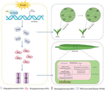 Drought is a major constraint on maize production, and understanding the underlying molecular regulators is key to breeding resilient varieties. Yang et al. investigated the role of the wall-associated kinase ZmWAK3 in maize seedlings and found it to be a negative regulator of drought tolerance. Loss-of-function mutants (zmwak3) survived drought stress better, showing higher photosynthetic efficiency, enhanced antioxidant activity, and improved cell wall integrity. In contrast, overexpression lines were more sensitive, with weakened walls, greater water loss, and reduced survival. Mechanistically, ZmWAK3 promotes polygalacturonase activity, leading to pectin degradation and cell wall loosening, which compromises water retention. It also impairs stomatal closure, thereby accelerating transpiration under drought. Conversely, mutants retained more pectin and displayed faster stomatal closure, reducing water loss. The transcription factor ZmWRKY44 directly binds the ZmWAK3 promoter, activating its expression under drought conditions. Silencing ZmWRKY44 lowered ZmWAK3 levels and improved drought tolerance, mimicking the mutant phenotype. Population analysis revealed natural variation at the ZmWAK3 locus, and the authors developed a functional marker (ZmWAK3-177) that reliably distinguishes drought-tolerant alleles. This provides a valuable tool for marker-assisted selection in maize breeding. Overall, this study uncovers a ZmWRKY44–ZmWAK3 regulatory module that links cell wall remodeling and stomatal dynamics to drought sensitivity. It highlights ZmWAK3 as both a mechanistic target and a breeding marker for developing maize varieties with improved drought resilience. Summary by Muhammad Aamir Khan (@MAKNature1998) Theor. Appl. Genet. 10.1007/s00122-025-05019-2