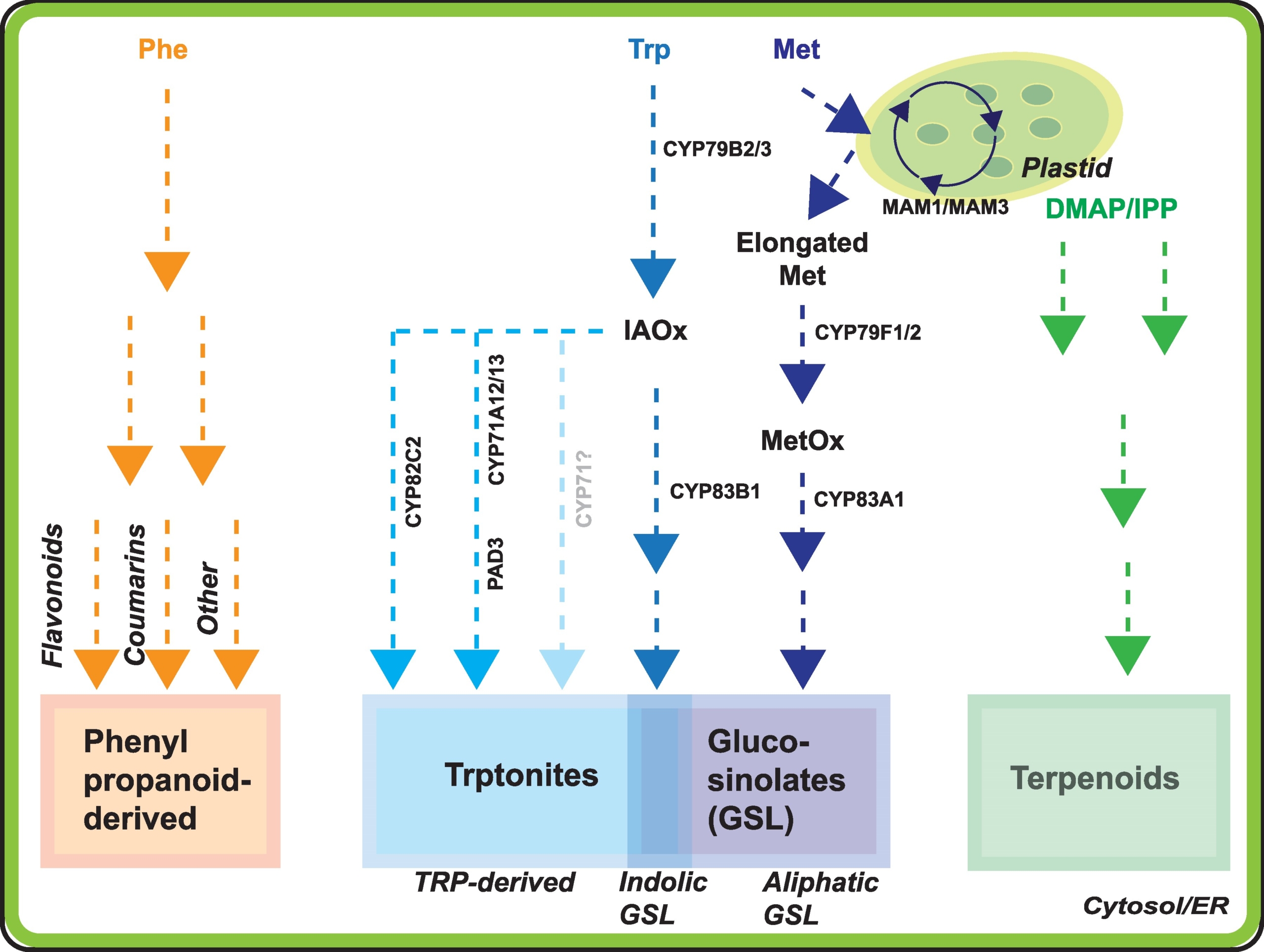 This review by Somssich et al., part of a forthcoming Focus Collection on Metabolites, provides an overview of the chemical arsenal of defense compounds in plants. Playfully titled “Guns in Rosettes”, it focuses on the well-characterized model plant Arabidopsis. The article discusses defense metabolites by chemical class, including terpenoids as well as compounds derived from methionine, tryptophan, and phenylalanine. The authors highlight that some of the compounds are made constitutively and some are induced. Additionally, the authors discuss many of the outstanding questions about how the defense arsenal is coordinated and integrated, such as how plants know when to make or deploy them, and whether they themselves act as signals to coordinate the plant defense responses. It’s a thorough yet accessible and enjoyable read. (Summary by Mary Williams @PlantTeaching.bsky.social) Plant Physiol. 10.1093/plphys/kiaf411